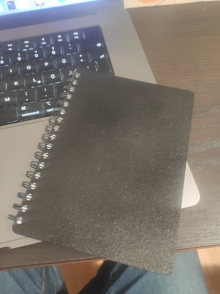 Листы — белые, разрезал специальным резаком для бумаги из бумаги для ксерокса плотностью 80 г/м². Дырки прорезал обычным дыроколом; для него я напечатал ограничитель, чтобы отверстия были на нужном уровне. Обложку напечатал на 3D-принтере из чёрного PETG-пластика — получилось очень стильно. Закладку-линейку напечатал тем же способом, что и обложку — она пристёгивается в произвольное место блокнота и может быть использована как закладка и как линейка. Пружину взял от старого блокнота - оказывается листы можно аккуратно вынуть и также аккуратно вставить, процесс требует аккуратности и времени, но конечный результат получился очень приятный!