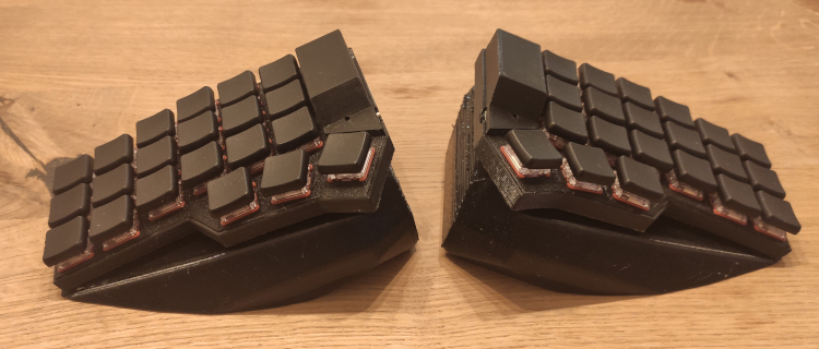 По-моему, наклон вполне правильный, и в собранном состоянии клавиатура теперь занимает ненамного больше места, но становится лучше защищённой при транспортировке. В разложенном состоянии половинки чехла служат наклонными подставками. Теперь нужно придумать механизмы фиксации — половинки должны крепиться к подставкам, а в собранном состоянии коробочка не должна рассыпаться. Думаю, тут можно использовать магниты. Посмотрим, что из этого выйдет.