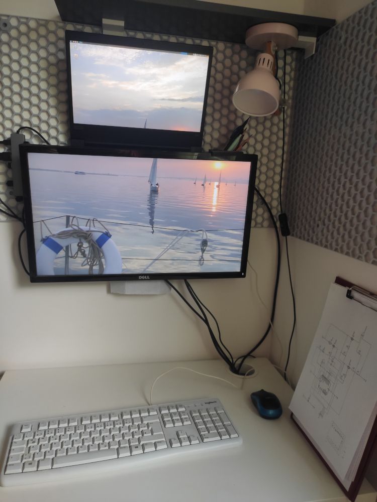 Прикрепил к стене распечатанную держалку для мелочей - компьютер уже держится ровно, не приходиться его подпирать стаканчиком для карандашей. USB-хаб тоже встал как надо. Теперь нужно напечатать остальные элементы конструкции чтобы можно было вешать наушники, клавиатуру, и внешние накопители.